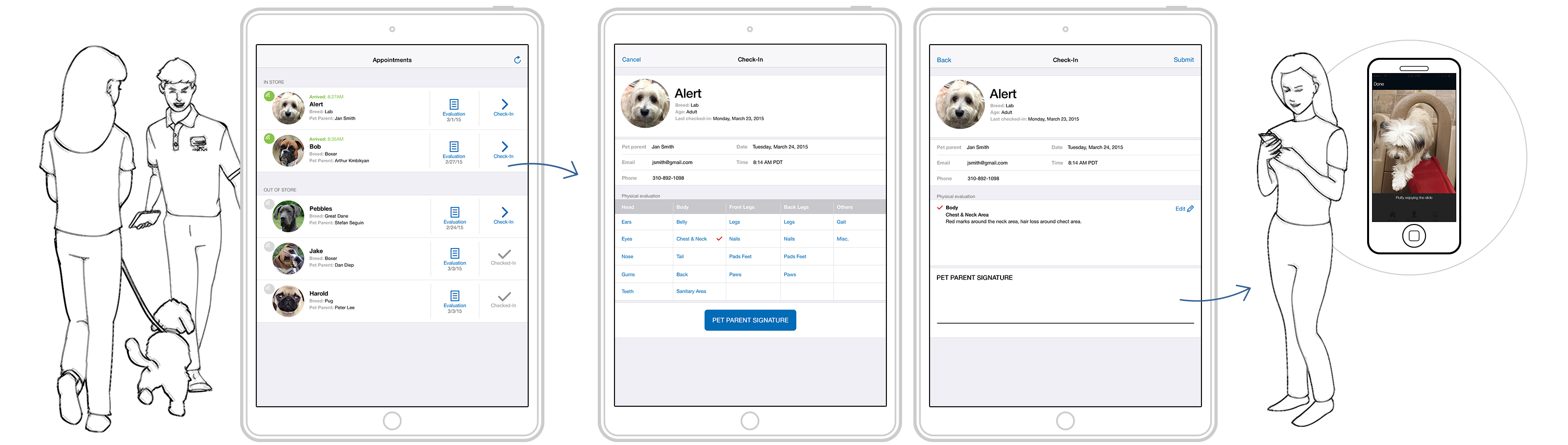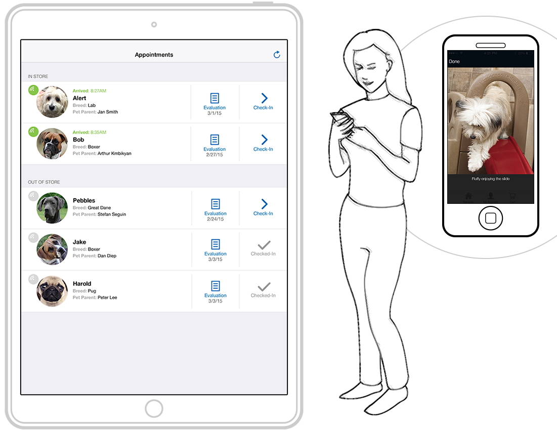 A proof-of-concept iOS tablet app was designed and developed with a check-in queue, evaluation form, and digital signature to simplify workflows and speed up the check-in process. By eliminating paper forms and introducing digital record-keeping, the experience was streamlined for both current and future pet stays.